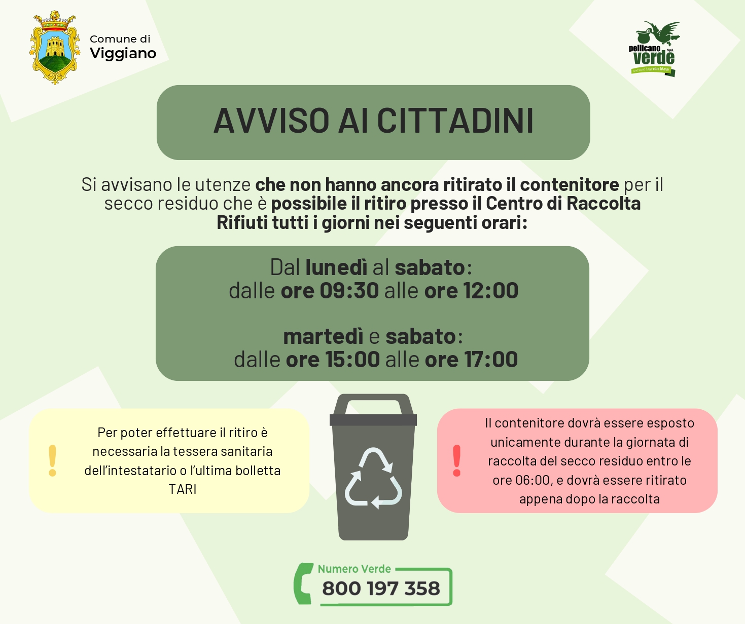 Testo completo title COMUNE DI VIGGIANO Provincia di Potenza Avviso ai cittadini: ritiro del contenitore per il secco residuo Il Comune di Viggiano (PZ) insieme a Pellicano Verde, informa le utenze domestiche che non hanno ancora ritirato il contenitore (mastello) per il secco residuo che il ritiro è possibile presso il Centro di Raccolta Rifiuti nei seguenti orari: Dal lunedì al sabato: dalle 09:30 alle 12:00 Martedì e sabato: dalle 15:00 alle 17:00 Per il ritiro è obbligatorio presentare la tessera sanitaria dell’intestatario dell’utenza oppure l’ultima bolletta TARI. Si ricorda, inoltre, che: il contenitore va esposto esclusivamente nel giorno di raccolta del secco residuo, deve essere posizionato entro le ore 06:00 del giorno di raccolta, va ritirato subito dopo l’avvenuto svuotamento. Per informazioni è attivo il Numero Verde 800 197 358. Si invitano i cittadini a ritirare il contenitore quanto prima e a rispettare le indicazioni sopra riportate per garantire un servizio di raccolta efficiente e ordinato.